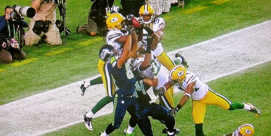 Wilson throws a desperate pass into the end zone. Jennings, the Mississippi guy, jumps up and snatches the ball clean. He has both hands on it and pulls it close. It should have been an interception. Packers win.